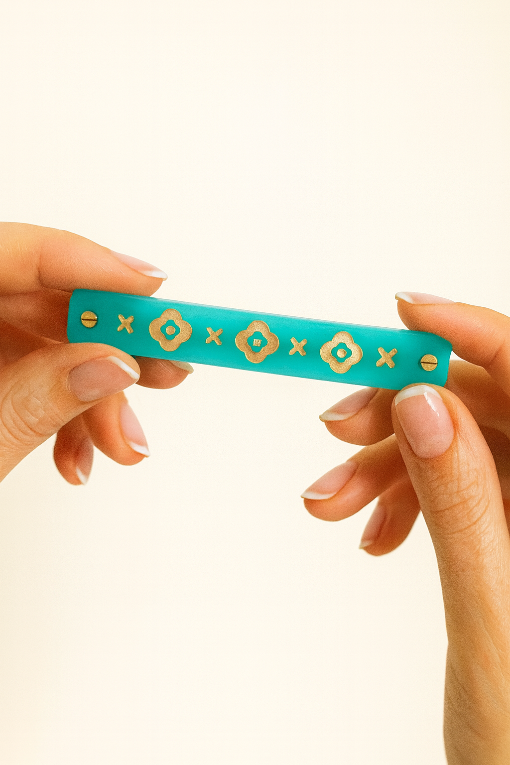 La barrette Victoria turquoise des îles et ses gravures florales émaillées d'or s’impose comme le modèle Signature de la maison muchacha.