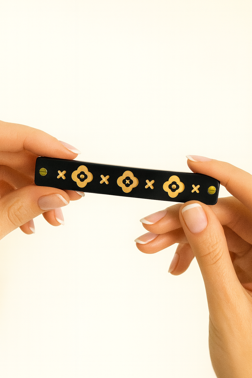 Sur son lit noir orage profond et mystérieux, ses gravures florales émaillées d'or révèlent toute la finesse de son design, combinant élégance et caractère pour sublimer chaque coiffure.
