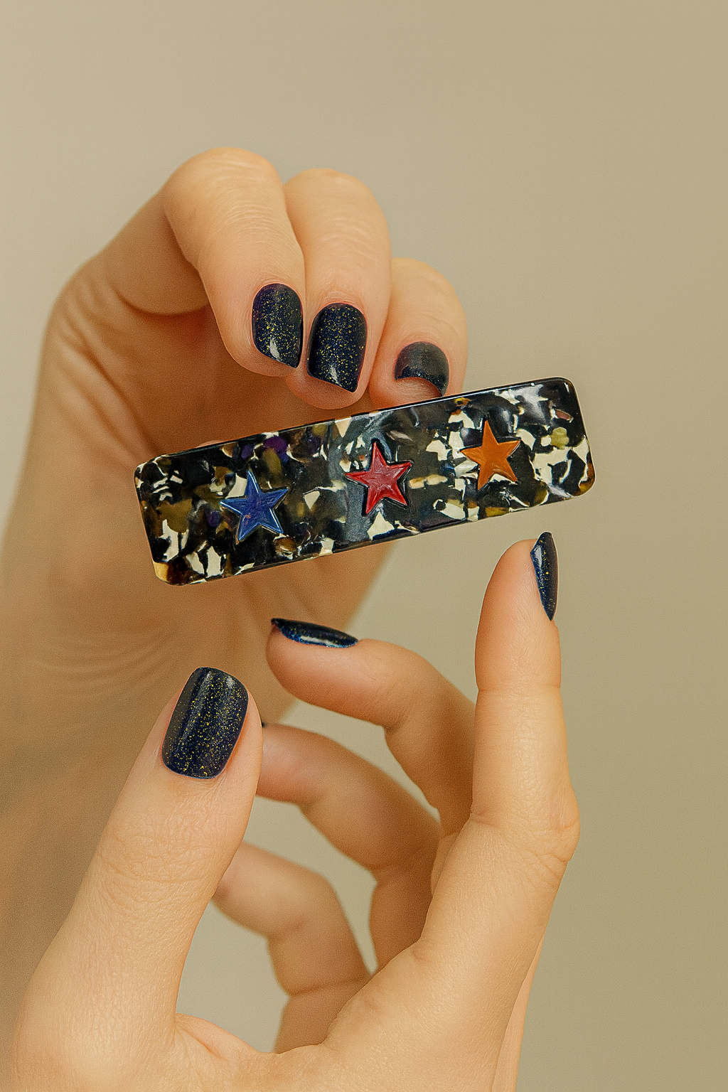 Parce qu'elle incarne à la fois la magie des étoiles et la modernité d'un bijou de tête . Ses reflets écaille multicolores illuminant vos coiffures, tandis que ses trois étoiles en font une pièce phare, élégante et intemporelle . Avec la barrette Tippi, chaque coiffure devient une constellation, chaque geste un éclat de lumière.